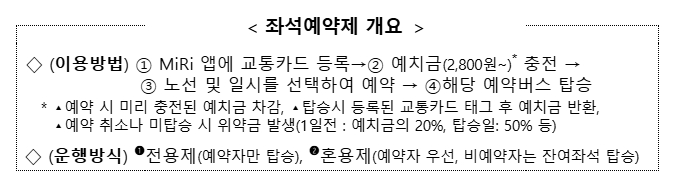 광역버스 좌석예약제는 모바일 앱 ‘MiRi’를 통해 탑승 시간과 정류소를 선택하고 미리 좌석을 예약하는 시스템입니다.