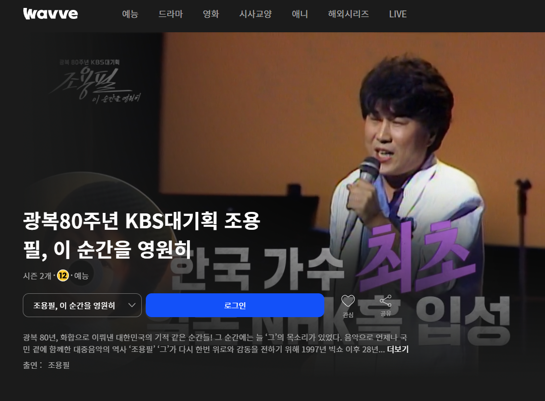 - 검색창에 ‘조용필 콘서트’ 또는 ‘이 순간을 영원히’ 입력